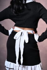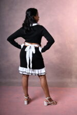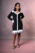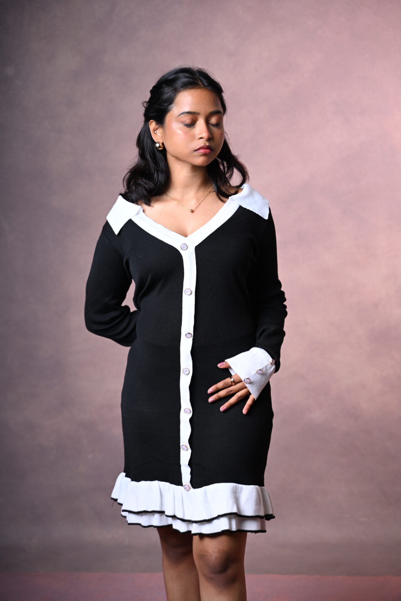 A stylish black knit dress with white trim, featuring a button-down front and playful ruffled hem — chic and versatile for day or evening.