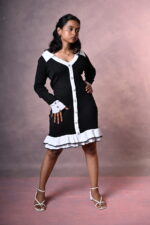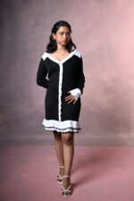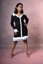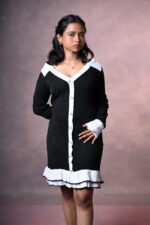 This elegant and eye-catching dress combines classic contrast with modern charm. Crafted in a black knit fabric, it features a crisp white collar, coordinating white cuffs, and a full button-down front placket. The silhouette is flattering yet comfortable, with long sleeves and a gently fitted waist. The standout ruffled hem adds movement and a feminine touch that elevates the whole look. Ideal for social events, dinners, or smart-casual occasions, this dress can be paired with heels or flats for a polished ensemble.