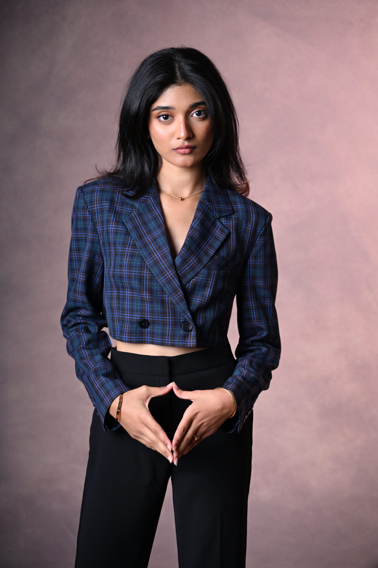 A chic cropped blazer featuring a classic plaid pattern and a tailored silhouette for a modern, polished look.