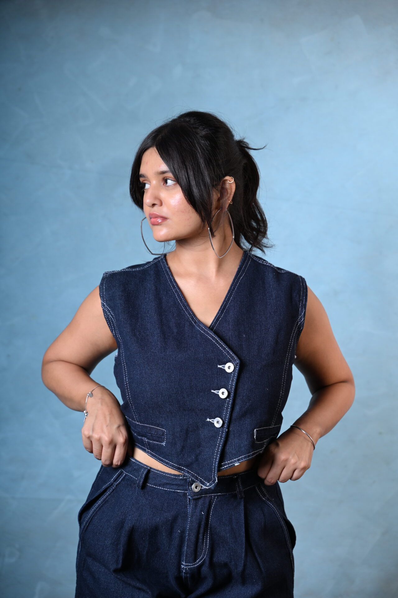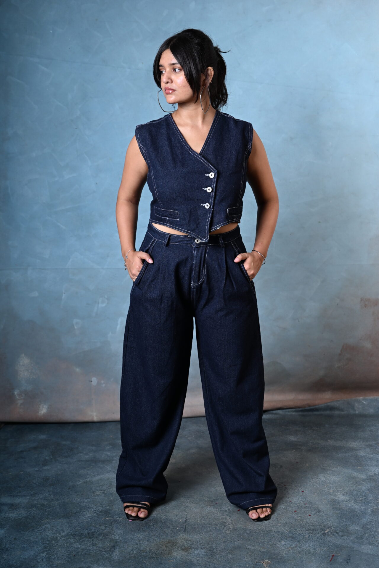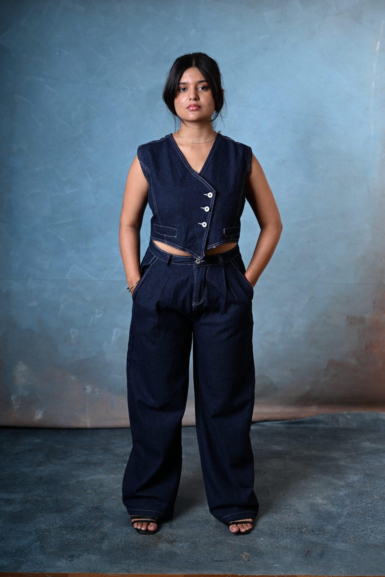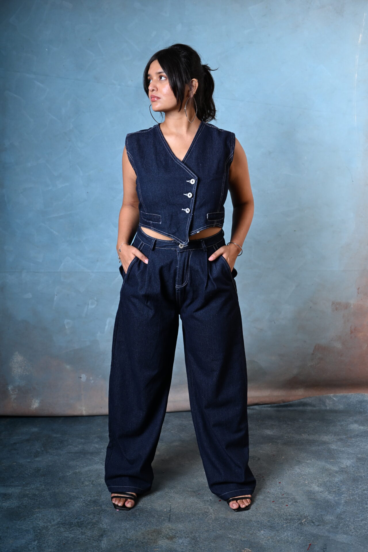 A modern dark-wash denim co-ord featuring an asymmetric buttoned vest and relaxed wide-leg pants for a confident, contemporary look.