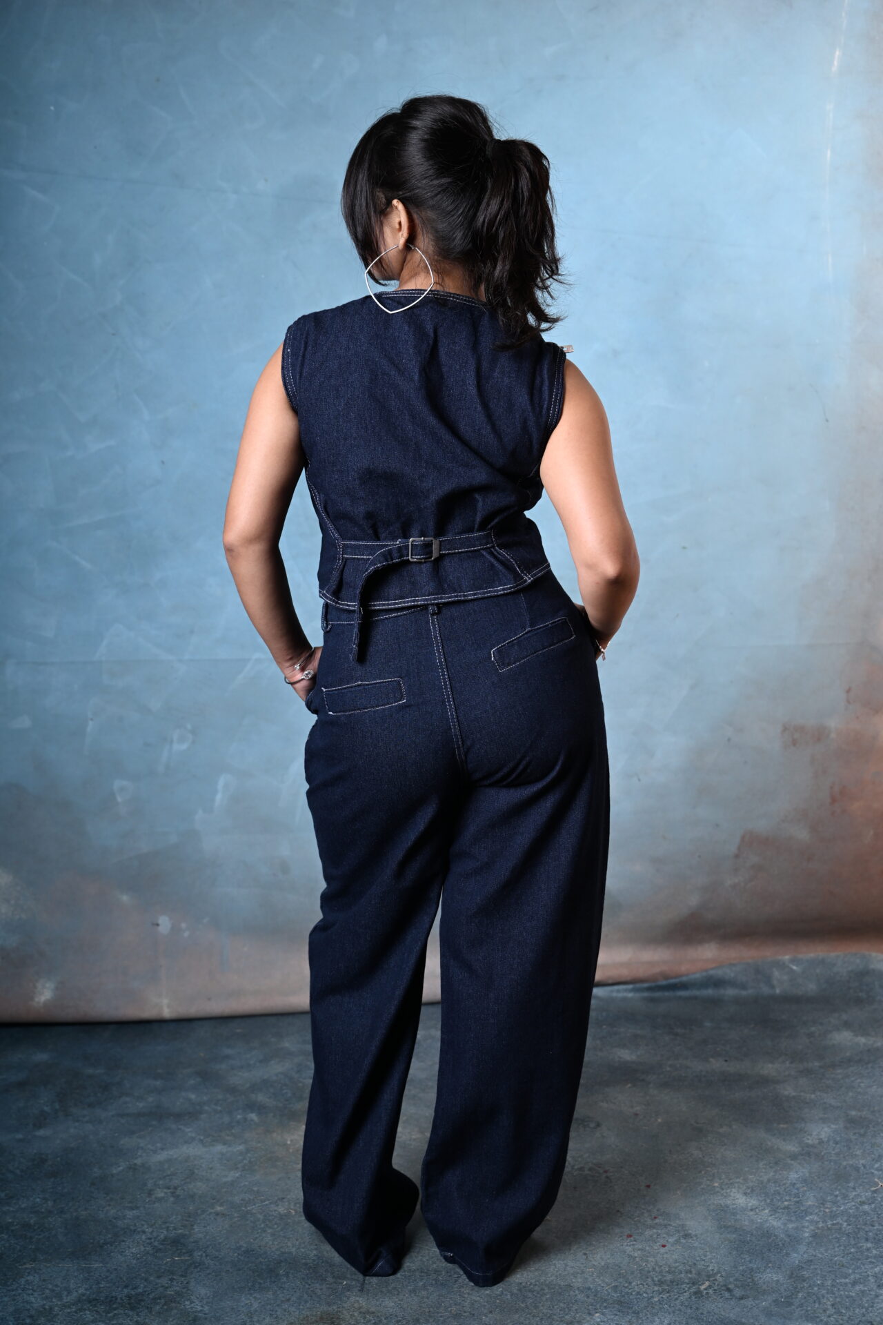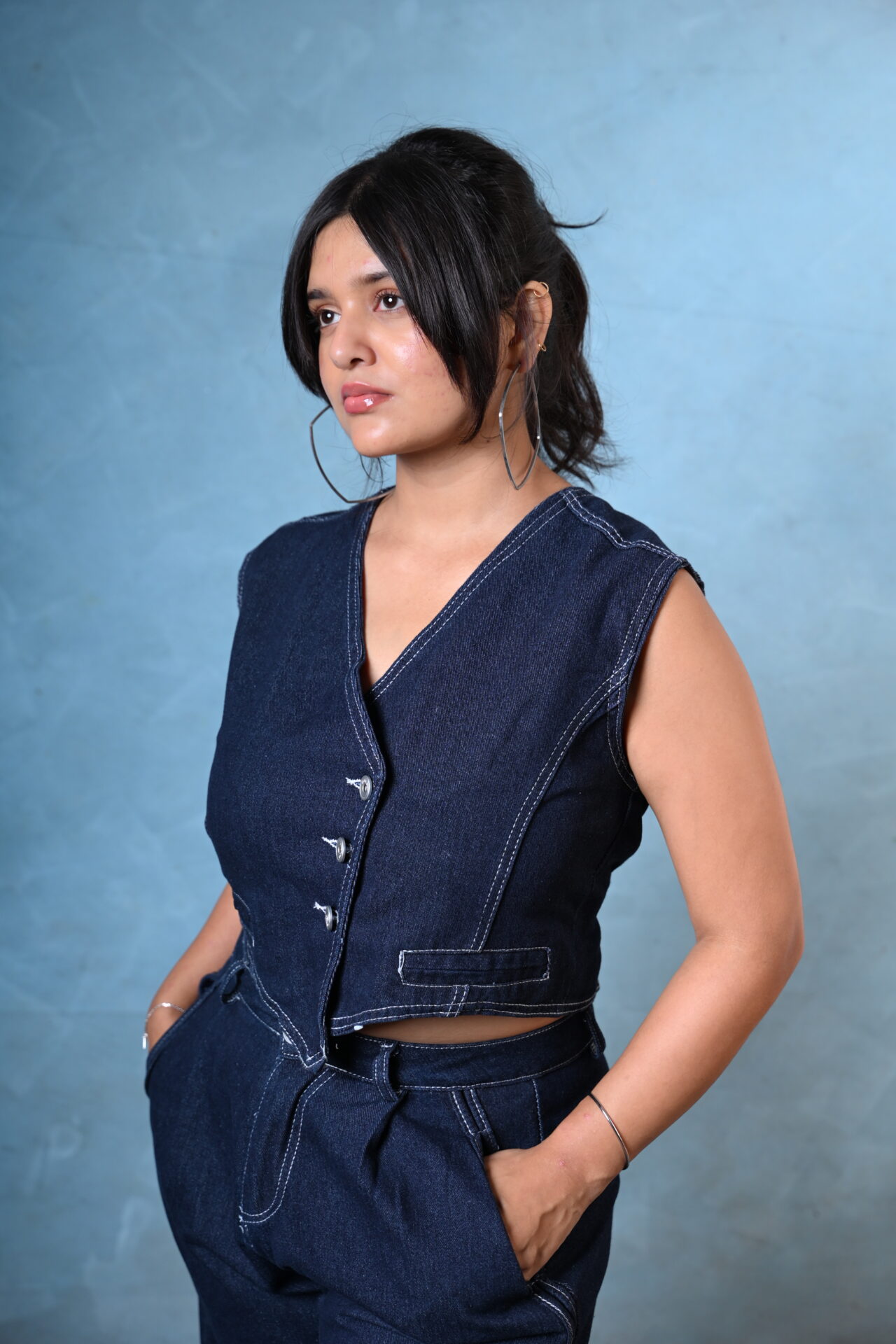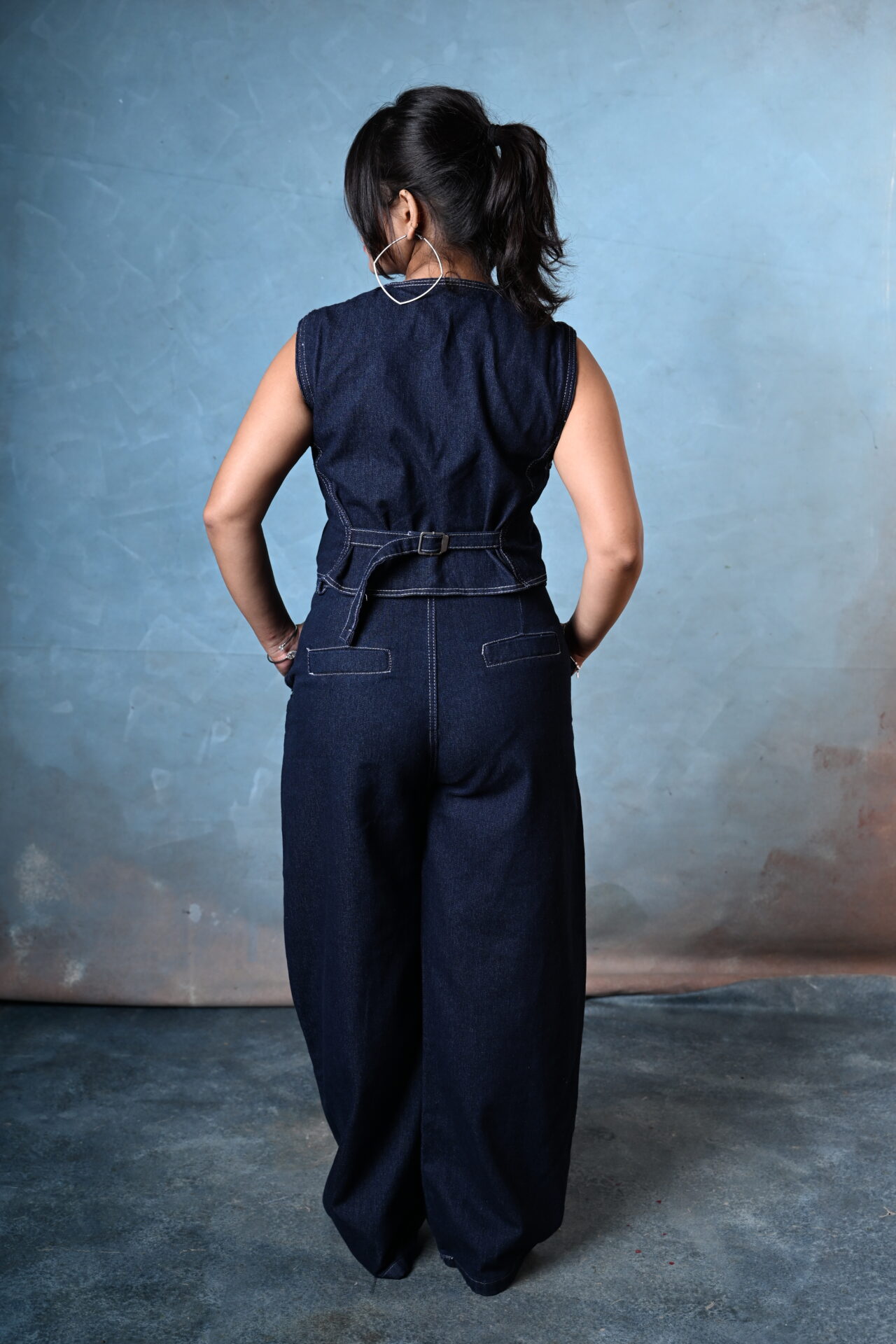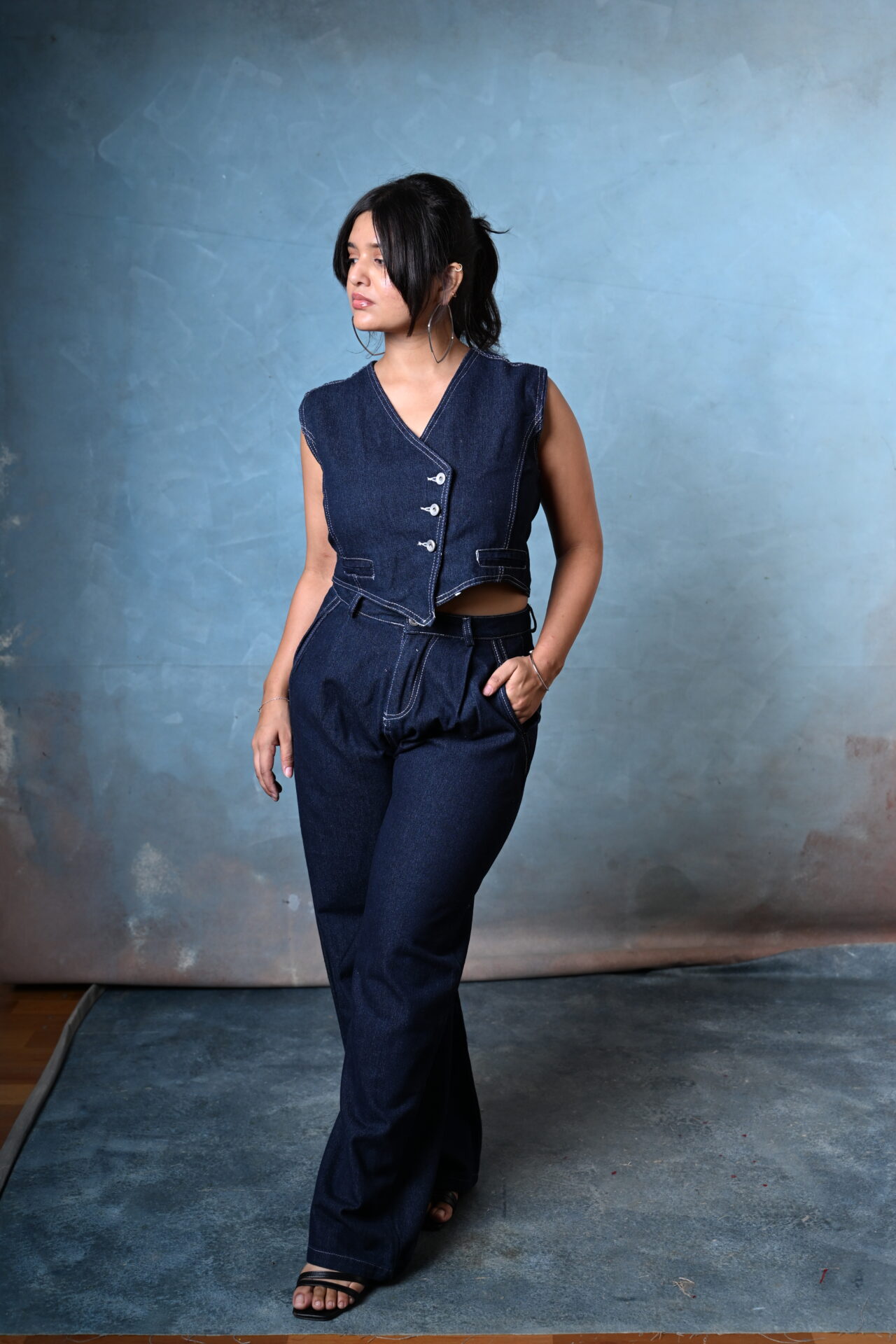 A modern dark-wash denim co-ord featuring an asymmetric buttoned vest and relaxed wide-leg pants for a confident, contemporary look.