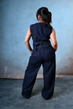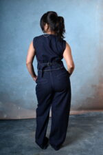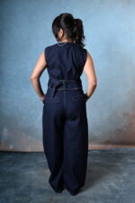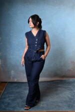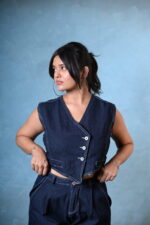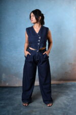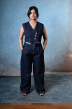 This denim co-ord set redefines casual sophistication with a bold, structured silhouette. The sleeveless denim vest is designed with a sharp V-neckline, asymmetric button closure, and tailored seams that create a flattering, cropped fit. Paired with high-waist, wide-leg denim pants, the set offers comfort without compromising on style. The rich dark-wash denim adds versatility, making it suitable for day-to-evening wear. Perfect for styling with heels, boots, or statement accessories, this ensemble delivers effortless confidence and a fashion-forward edge ideal for modern wardrobes